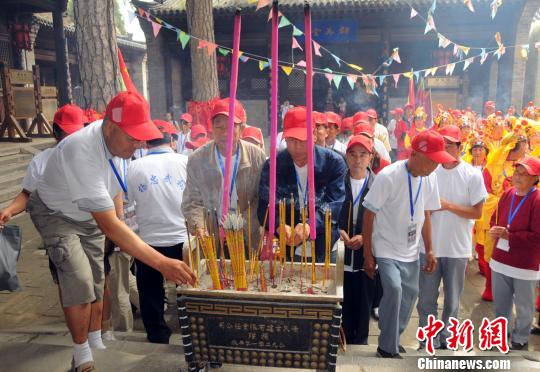 8日,来自台湾的姓氏宗亲联谊团聚集在有着“中华第一关”之称的雁门关镇边祠祭祀先祖。杨家将后裔向先祖敬香。石俊文 摄