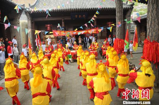 杨家将后裔祭祖团敲响杨家将出征鼓乐。石俊文 摄