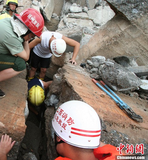 图为当地消防部门正在救援被压在混凝土下的伤者。中新社发 王剑 摄