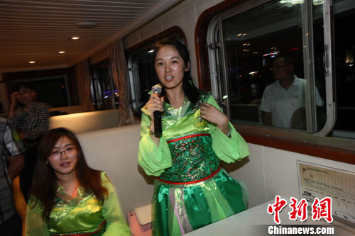 8月23日晚,青岛市40余名男女青年身着汉服,登上“海上明珠号” 游艇,在游艇上观赏夜景,游戏玩耍,交友派对,共度浪漫“七夕”情人节。中新社发 徐崇德 摄