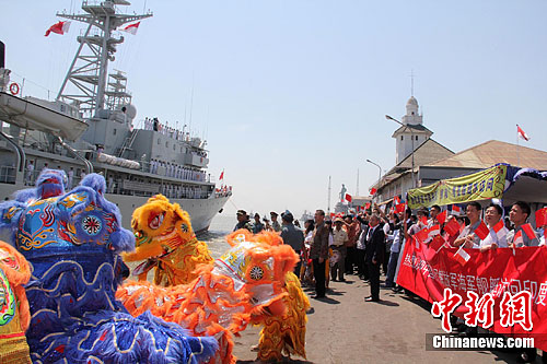印尼海军为“郑和”舰到访举行了热烈的欢迎仪式。印尼海军代表向到访的指挥官献花,当地民众表演了传统的迎宾舞,华人舞狮队进行了精彩的舞狮表演。中新社发 顾时宏 摄
