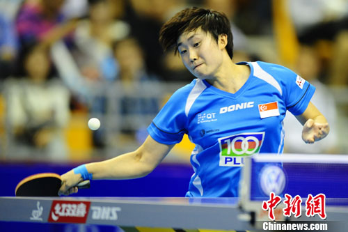 9月22日,在2012女子乒乓球世界杯第二比赛日四分之一决赛中,新加坡队遭遇内战。最终冯天薇在先失三盘的情况下惊险逆转晋级四强,而她的队友于梦雨则止步八强。图为冯天薇在比赛中。 中新社发 崔楠 摄