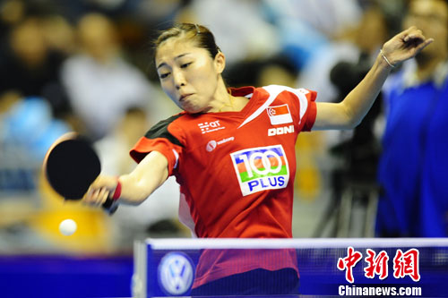 9月22日,在2012女子乒乓球世界杯第二比赛日四分之一决赛中,新加坡队遭遇内战。最终冯天薇在先失三盘的情况下惊险逆转晋级四强,而她的队友于梦雨则止步八强。图为于梦雨在比赛中。 中新社发 崔楠 摄