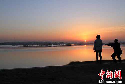 图为早起的民众在黑河沿岸一边锻炼身体,一边欣赏日出景象。陈礼 摄