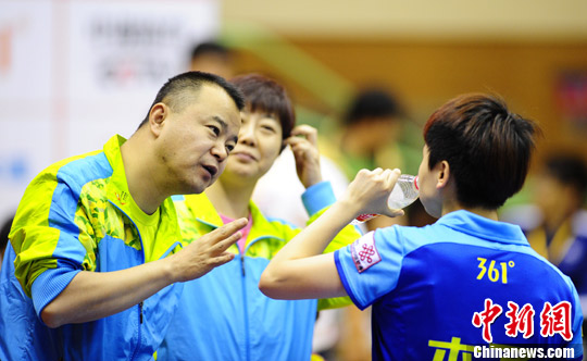 11月14日,中国乒乓球超级联赛迎来第二阶段第一轮较量。图为对峙之后八一队主教练在试图稳定本队队员心态。中新社发 崔楠 摄