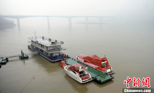 11月15日,重庆市气象台发布今年冬天首个“大雾黄色预警信号”,受大雾的影响,江面上的游船只能停止营业。图为船舶停靠岸边歇业。中新社发 陈超 摄