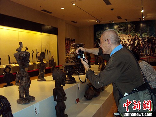 11月15日,来自撒哈拉地区十余个国家的百余个部族的182件雕刻文物艺术品在海南省博物馆展出。展品以木雕为主,兼有陶雕和骨雕。展品分为三大部分:舞动的神灵——面具;灵与巫的象征——雕像、图腾、权杖和法器;独特而神秘的装饰——建筑构件和生活用品。图为市民在海南省博物馆用相机拍摄非洲雕刻文物。中新社发 张茜翼 摄