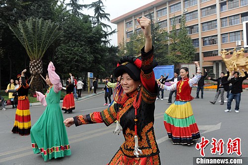 11月15日,西南民族大学校园内一群少数民族学生,穿戴民族服饰跳起了“骑马舞”,引来师生围观。中新社发 张浪 摄