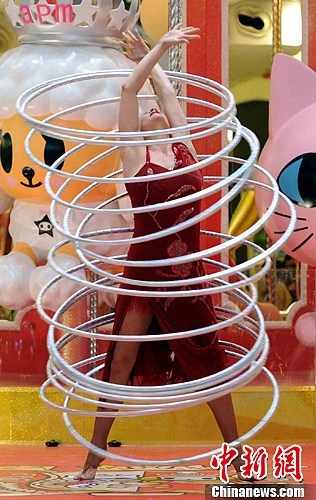 11月15日,马戏杂技巨星表演呼拉圈。临近圣诞节。香港apm商场邀请了世界级马戏杂技巨星MariaMargiyeva作亚洲公开首演。中新社发 谭达明 摄