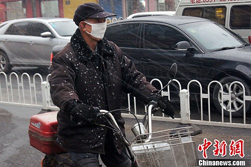 11月15日下午,山西太原迎来今冬首场降雪,民众在街头冒雪出行。中新社发 张怡 摄