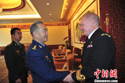 11月16日,中国空军司令员马晓天空军上将在北京钓鱼台国宾馆会见了新西兰国防军副司令斯蒂尔海军少将。 中新社发 廖攀 摄