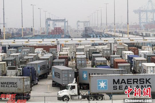 当地时间12月5日,美国洛杉矶和长滩的运输公司员工代表在星期二晚与资方达成暂定协议,结束了为期8天的罢工行动。图为大批货柜运输车排队进入码头。中新社发 林戈 摄