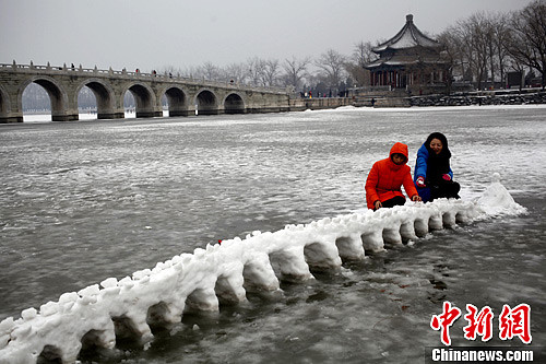 12月16日,连续两场降雪后的北京颐和园银装素裹,两名游客在颐和园十七孔桥前观赏雪版的“十七孔桥”。中新社发 王磊 摄