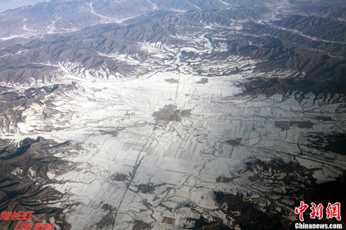 12月17日,飞机早晨从北京西郊机场起飞后不久,空中航拍一处雪景,画面颇似北京城区地图。北京当日一扫之前持续多日的阴霾天气,雪后放晴能见度高。中新社发 孙自法 摄
