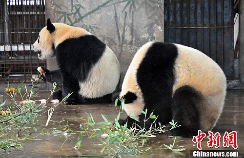 1月9日,杭州动物园大熊猫娅琳从虎跑路出发前往萧山机场,离开杭州,搭机回四川。娅琳如今5岁啦,即将成年,它需要回去接受性教育启蒙,需要跟母熊猫培养感情,恋爱结婚、生儿育女。图为大熊猫娅琳和蜀云。中新社发 李晨韵 摄
