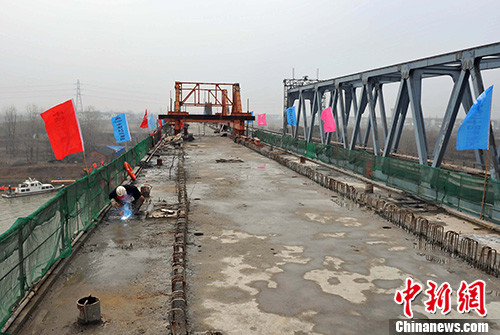 1月22日,位于江苏扬州市的宁(南京)启(启东)铁路复线京杭运河特大桥主跨合龙。中新社发 刘江瑞 摄 图片来源:CNSPHOTO