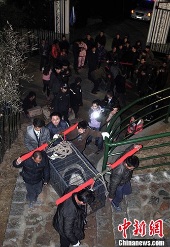 1月22日晚,一雄一雌两只大熊猫,由四川雅安市的中国保护大熊猫研究中心碧峰峡大熊猫基地,飞抵浙江德清县境内的国家级湿地公园下渚湖湿地风景区。中新社发 姚学良 摄 图片来源:CNSPHOTO