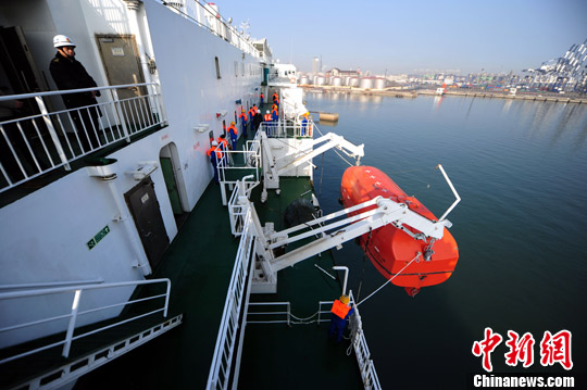 图为消防救生演练现场,模拟下放救生艇。郝光亮 摄