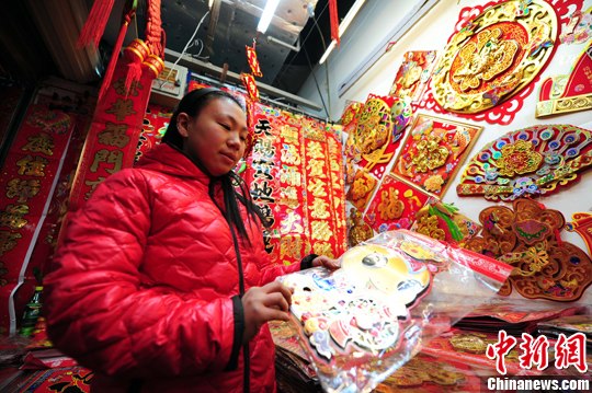 1月23日,沈阳市民在市场购买春联。当日,辽宁省沈阳市五爱批发市场内众多市民前来购买春联。中新社发 于海洋 摄