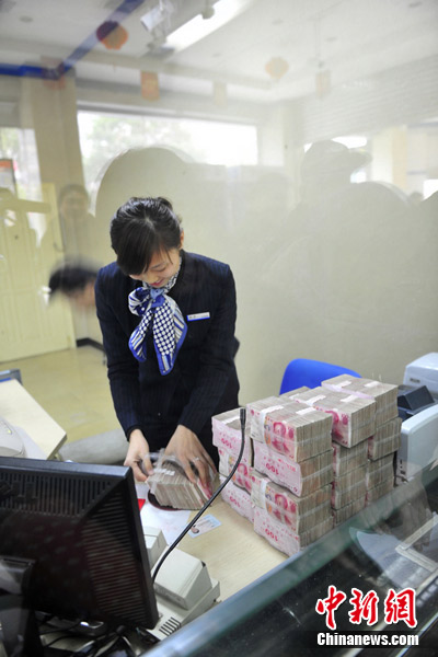 由于金额巨大,银行工作人员仔细清点212万元现金。 胡坚 摄