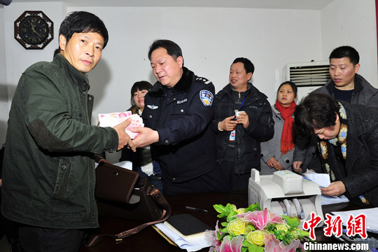 图为1月23日,数十名农民工兄弟接过派出所社区民警替他们“讨”来的212万的现金。 胡坚 摄