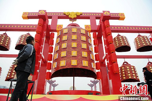28日,一座高约10米的巨型“编钟”亮相西安市大唐不夜城,吸引了不少游人驻足参观。随着春节临近,西安街头的年味也越来越浓。图为巨型“编钟”。张远 摄