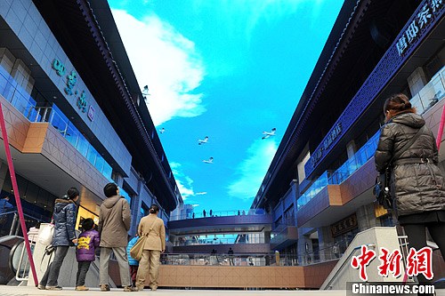 28日,在西安市大雁塔旁的一商场内,一块巨大的LED穹顶天幕吸引了众多游客驻足参观。据介绍,该LED天幕长168米、宽17.92米,面积超过3000平方米,号称亚洲室内最大的全彩LED显示屏。图为LED天幕吸引了众多游人参观。张远 摄