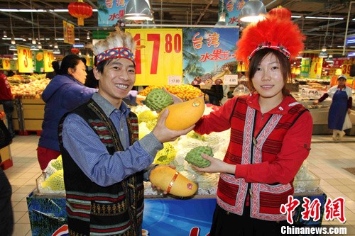 1月28日,“2013台湾精品水果节”在北京一超市开幕,台湾精品水果不仅品种齐全,品质优秀,且价格均走平价路线,受到消费者青睐,更成为京城年货市场上的“新宠”。图为水果节的工作人员身着台湾少数民族服装推销水果。中新社发 潘旭临 摄