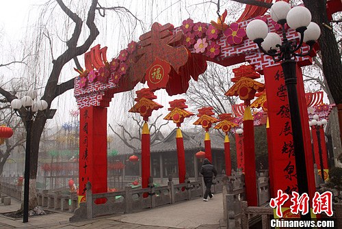 图为1月31日重霾锁城中,济南趵突泉公园搭建着迎接新年的拱门,期盼新春降临。中新社发 胡洪林 摄