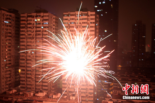 图为正月初五零时,南京新街口地区的楼宇间,许多市民正在燃放烟花炮竹。中新社发 卢辉 摄