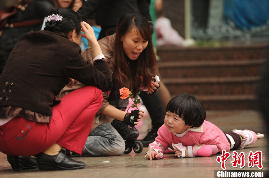 3月10日,一小孩在玩直排轮时不慎跌倒,家长和教练拿着一枝花作为奖励,鼓励孩子自己在哪里跌倒就在哪里站起来。中新社发 陈超 摄
