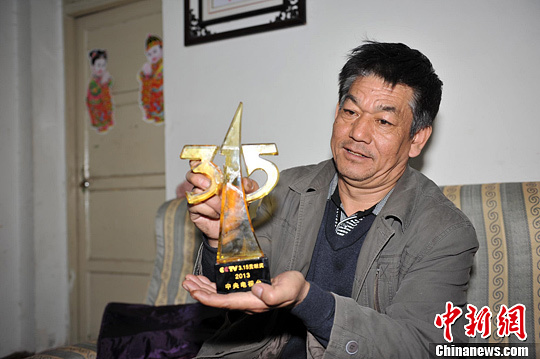 “诚信鸡蛋哥”展示央视3·15获奖奖杯。胡影 摄