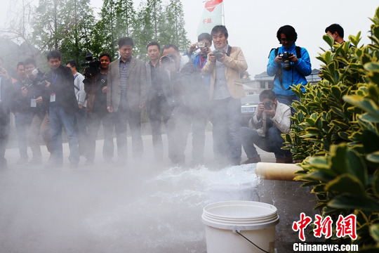 图为记者争相拍摄星子庐山温泉出水口。中新网记者 周维 摄