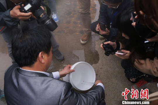 图为现场工作人员量取温泉水温。中新网记者 周维 摄
