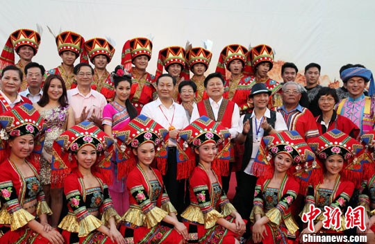 在丰滨乡举行的桂花(广西与花莲)乡村里长联欢会上,彭清华和花莲县长傅崐萁与当地民众联欢。周群 摄