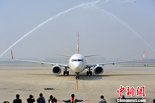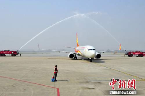 5月2日,山西太原武宿机场举行“过水门”欢迎仪式,庆祝海南航空公司成立20周年。在民航行业,“飞机过水门”具有很高的礼仪级别,这也是山西机场首次上演“过水门”仪式。中新社发 韦亮 摄