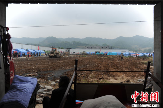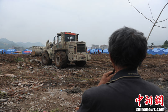 5月7日,在芦山县清仁乡最大的安置点,部队官兵正忙碌着平整土地、覆盖沙石、修建排水沟,防止雨水渗透。中新社发 张浪 摄
