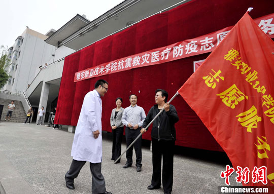 图为范徐丽泰为学院志愿者服务队授旗。中新社发 安源 摄