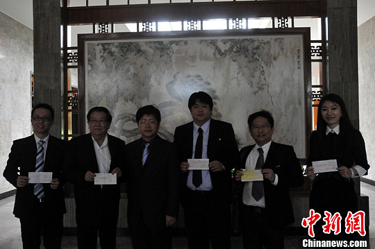 5月8日,马来西亚中国留学生代表和部分华人在吉隆坡将5万令吉(约合1.67万美元)支票移交给中国驻马来西亚大使馆领事参赞林栋(左3),支援灾区重建。中新社发 黄鸿斌 摄