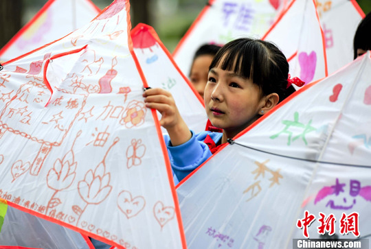 5月9日,在北京红领巾公园,20余名来自安民学校的四川籍学生将自己的梦想和祝福描绘在风筝上,通过放飞风筝向远在四川雅安等家乡的亲人送上祝愿。中新社发 陆欣 摄