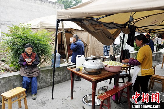 5月11日,记者走进震区芦山龙门敬老院,探访生活在这里的61位老人的震后生活。图为敬老院的临时厨房。安源 摄