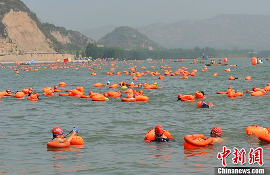 击水中流、劈波斩浪,游泳爱好者们在奋力横渡黄河母亲河。陈巍高 摄