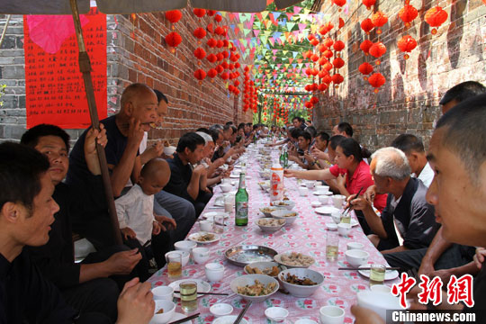 5月23日,2013阳朔葡萄诸葛亮文化节在广西最大的诸葛村——桂林市阳朔县葡萄镇翠屏村举行。图为诸葛长桌宴。中新社发 贺振敏 摄