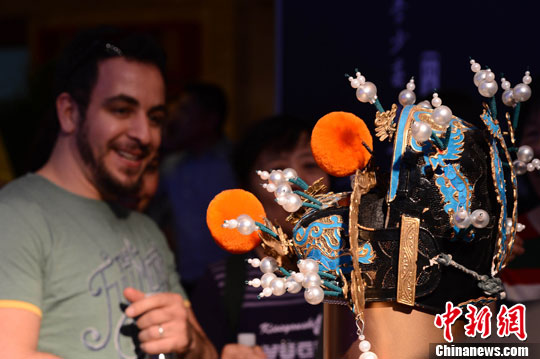 5月23日晚,第一部以纪录影像来解读京剧艺术,面向全世界展示的电视纪录片作品——8集大型纪录片《京剧》首映式在北京梅兰芳大剧院举行。图为现场进行的京剧道具展示、现场化妆吸引了中外观众。中新社发 李学仕 摄