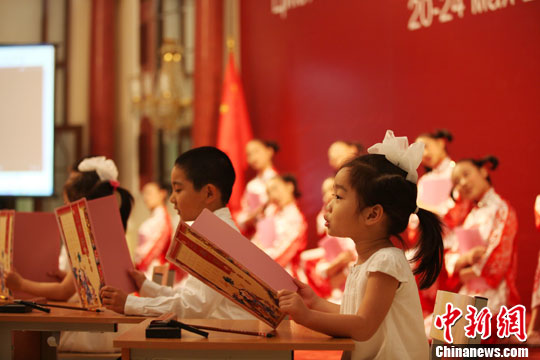 莫斯科中国文化中心5月23日晚举行俄文版《三字经》新书推介会,该推介会是20-24日“品读中国”读书周中的一项活动。图为孩子们朗诵中文《三字经》。中新社发 贾靖峰 摄