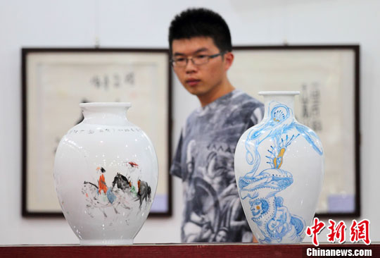 5月24日,一位收藏爱好者被展出的瓷器吸引。中新社发 泱波 摄