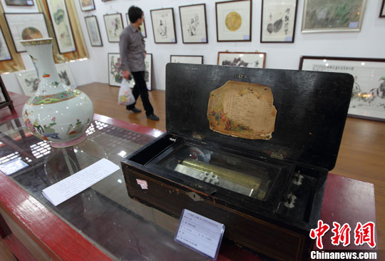 图为一件产自于十九世纪法国的音乐盒,虽历经岁月,但由于其能连续播放12首纯正而浓厚的美妙音乐令观众赞叹不已。中新社发 泱波 摄