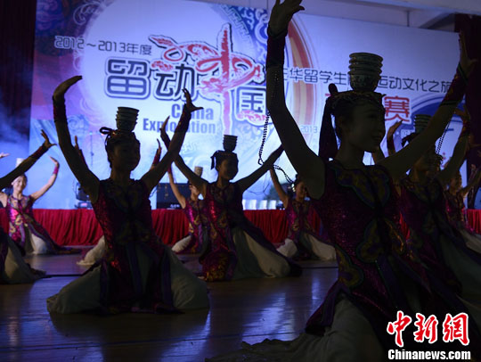 5月24日上午,2012-2013年度“留动中国——在华留学生阳光运动文化之旅”九州赛第八赛区(内蒙古赛区)比赛在内蒙古大学开幕,中外学生携手表演了开幕式的文艺节目,场下喝彩声不断。图为开幕式上的“顶碗舞”表演。中新社发 刘文华 摄