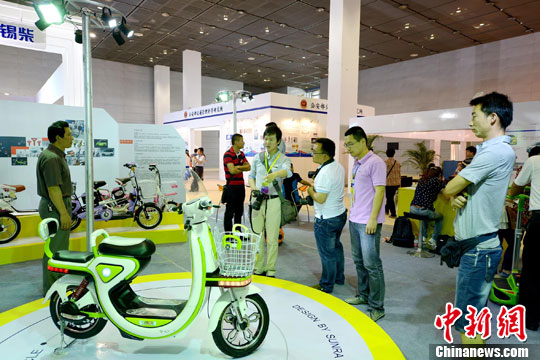 图为观展者被展出的新型环保电动车吸引。中新社发 李一芳 摄