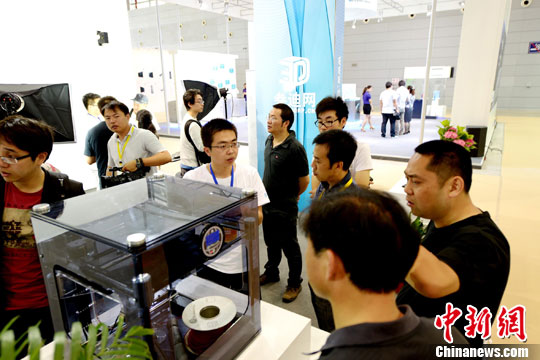 图为观展者们齐聚3D打印机旁听工作人员进行介绍。中新社发 李一芳 摄